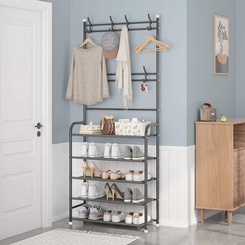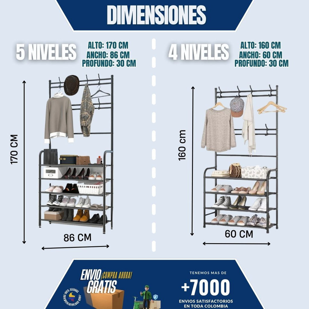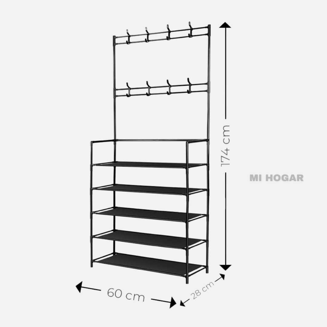 Este elegante organizador de entrada de 4 y 5 niveles está diseñado para ofrecerte una solución de almacenamiento completa en un solo lugar. Su estructura robusta de acero inoxidable negro combina estilo y funcionalidad, permitiéndote mantener tus abrigos, zapatos y accesorios siempre en orden.